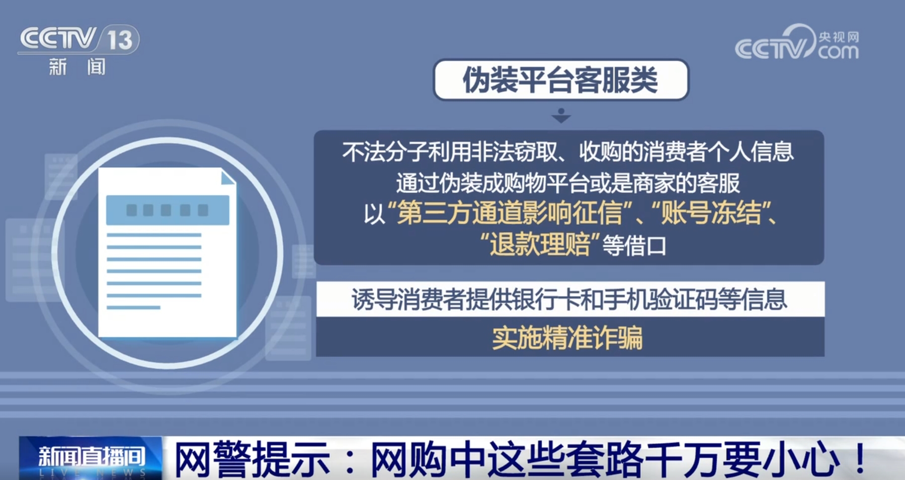 不法分子利用非法窃取、收购的消费者个人信息★★★,通过伪装成购物平台或是商家的客服,以“第三方通道影响征信”“账号冻结★★”★★“退款理赔”等借口★★,诱导消费者提供银行卡和手机验证码等信息★★,实施精准诈骗★★。